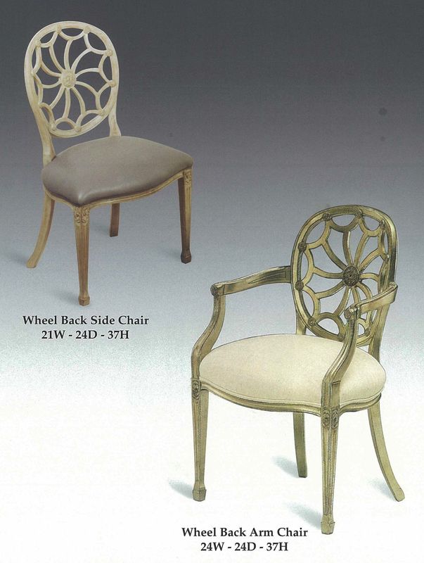 Wheel Back arm chair available in various finishes and fabrics. Side chair available.