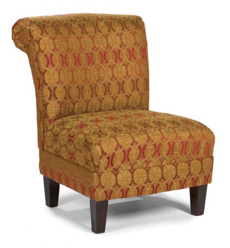 Armless lounge chair with exposed wood legs. Tight back, Tight seat. Available in numerous fabrics and finishes.