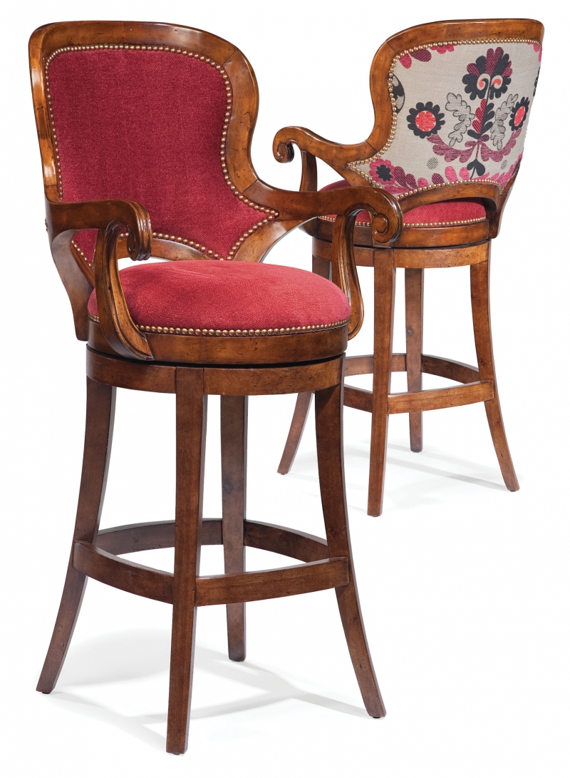 Barstool features a swivel seat. Tight Back/Tight Seat. Small nail-head trim standard.