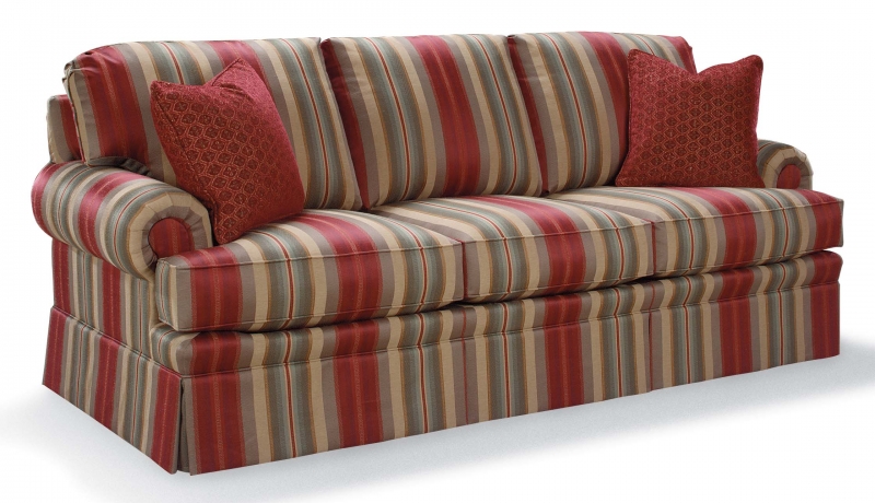 Rolled arm tall skirted sofa. Shown with optional contrasting fabric on throw pillows.