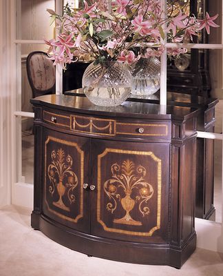 Burly Walnut Field w/Striped Walnut Border Top. Hand-painted Fineline Between Border and Field. Hardwood Marquetry Door Panels. Walnut Solids. 1 Drawer. No Locks. Adjustable Shelf Behind Doors.