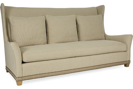 Copley Long Sofa Shown with optional contrasting fabric band and small spaced nail trim around base. Standard with saddle-stitched bench cushion as shown.