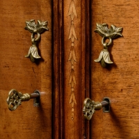 Adams style demilune cabinet with inlayed Grecian urns and floral swags in Walnut and Satinwood veneers. 48W x 28D x 37.75H