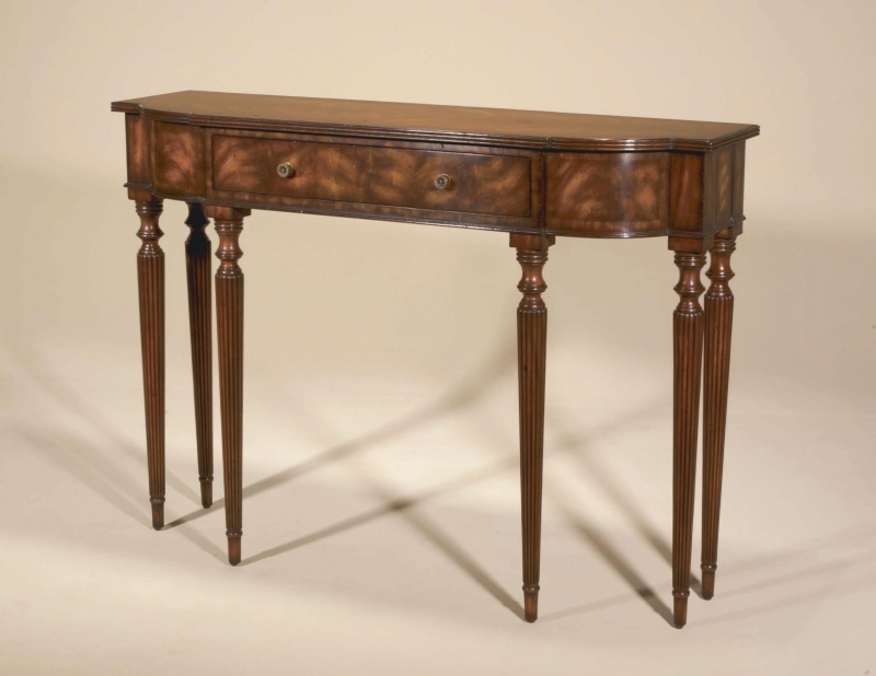 Mahogany Sheraton Sofa Table, Crotch Veneers, Tapered Leg, with center cross banded drawer. Dimensions: 49.0W x 14.0D x 35.0H inches