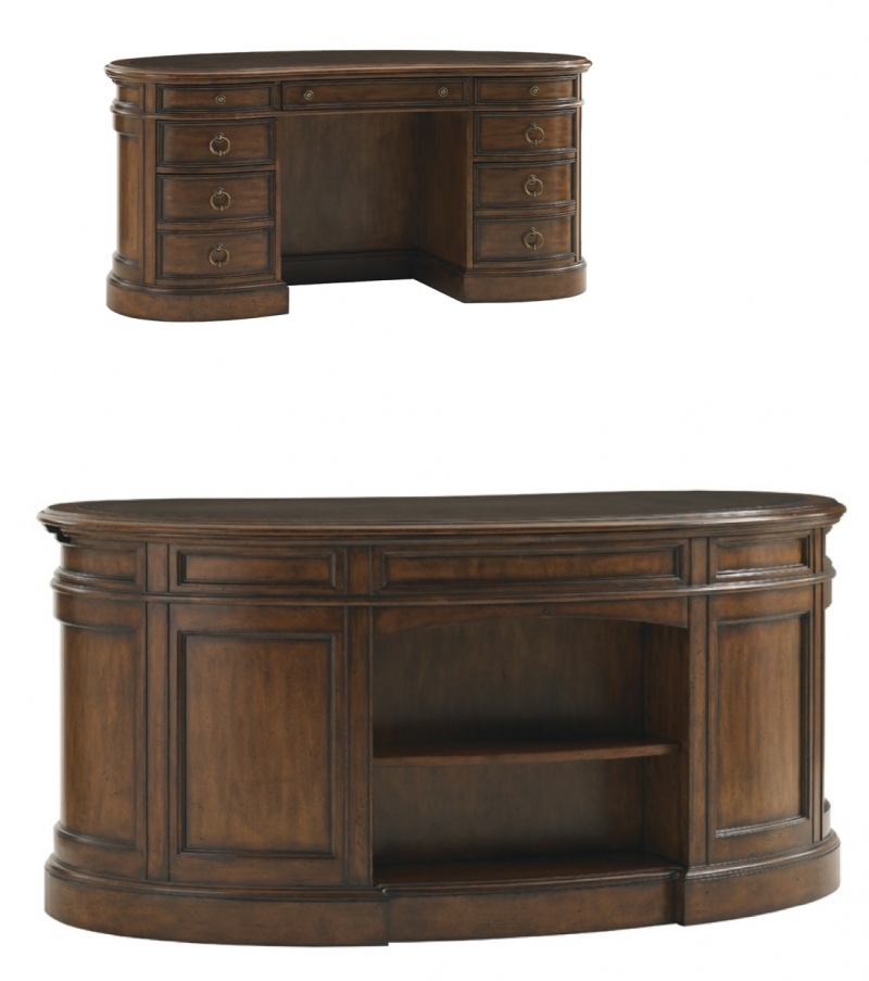 Kidney shape desk with brown leather, antique tooling accents and unobtrusive cord management pathways at both ends. Drop-front keyboard drawer includes an ergonomic wood palm rest. Each pedestal includes two box drawers and a file drawer, with lockable left-hand side. Outward facing side features an adjustable shelf for display or library. Custom designed hardware with an antique brass finish. Adjustable floor levelers. 64" W x 32 1/2" D x 30" H