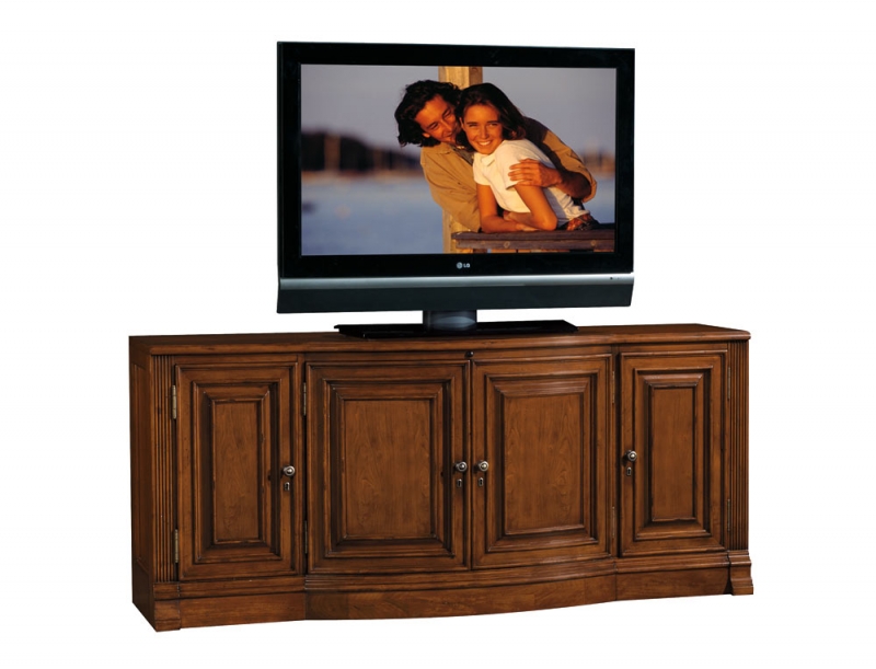 Entertainment credenza with sets of wood doors concealing one adjustable wood shelf. Surge suppressor with warranty includes five electrical outlets. Infrared Smart Eye allows for remote control of concealed electronic components. Dark antique brass drawer pulls. Adjustable floor levelers. Removable rear access panel. 68"W x 19 1/8"D x 30 1/8"H Accommodates televisions up to: 67 3/4"W x 14 3/4"D