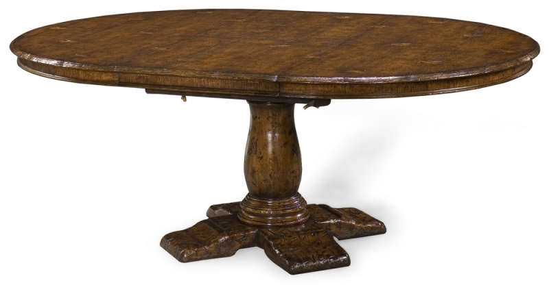 French country style extending dark brown oak round dining table with a heavy pedestal base, distressed planked top, exposed butterfly joints and single self storing leaf. Seats: 7 + 2. Dimensions (W x D x H) 54 x 54 x 30 inches